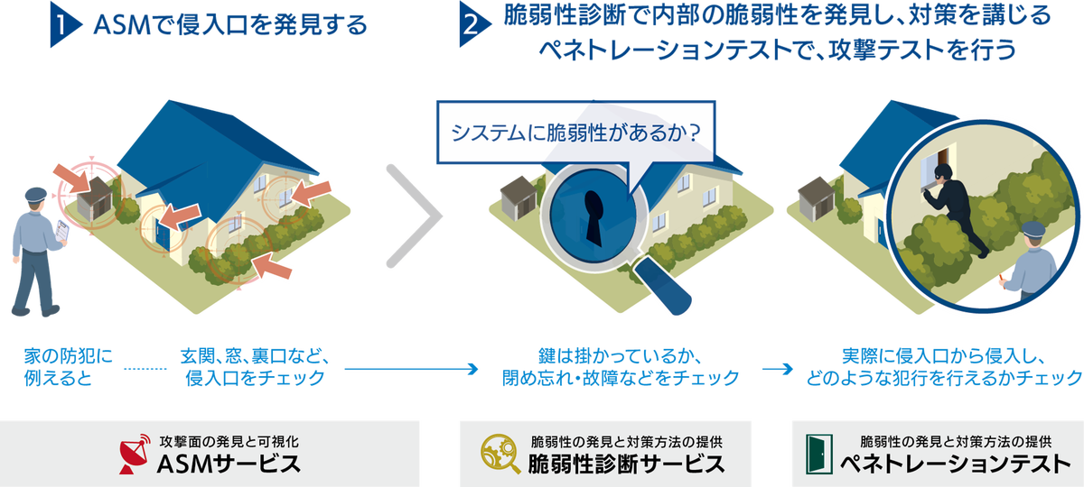 例えるのであれば、建物にある"入口"や"窓"を探し出し、鍵の掛け忘れや壊れた扉を見つける、防犯パトロールのような役割です。