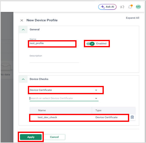 「Device Test Type」としてデバイス用の証明書である「Device Certificate」を指定し、さらに「New Device Profile」でプロファイルを新規作成しました。
