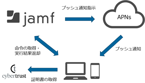 Apple 製デバイスの管理 / 制御を行うため、Jamf Pro は Apple 社の APNs(Apple Push Notification service)と通信する必要があり、その際に Apple プッシュ証明書が必要です。