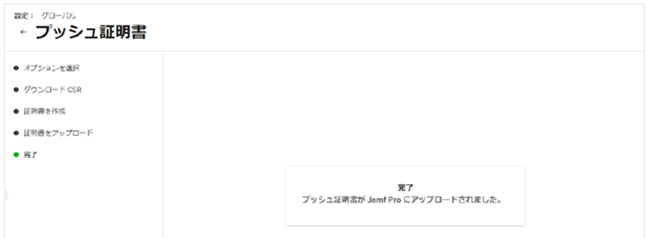 - 取得した Apple プッシュ証明書を Jamf Pro の管理コンソールにて登録