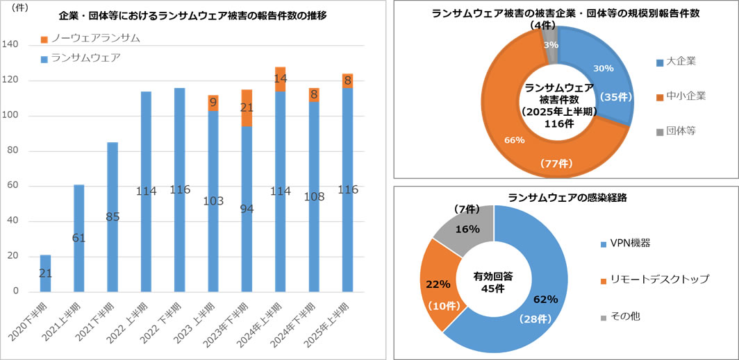 警察庁サイバー警察局が公表するレポート「令和 7 年上半期におけるサイバー空間をめぐる脅威の情勢等について」によると、2025(令和 7)年上半期におけるサイバー犯罪の検挙件数が 6,625 件に達し、このうち 465 件がサイバー攻撃に該当し、前年と比較して増加していることが報告されています。また、ランサムウェアによる被害報告件数は 116 件あり、2022(令和 4)年下半期と並んで最多となっています。これらのランサムウェアの感染経路は、VPN 機器やリモートデスクトップからの侵入が全体の 8 割以上を占める状況で、ID・パスワードなどが非常に安易であったことや不必要なアカウントが適切に管理されずに存在していたという分析結果が挙げられています。