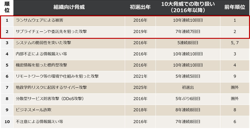 出典:情報処理推進機構(IPA)「情報セキュリティ 10 大脅威 2025」