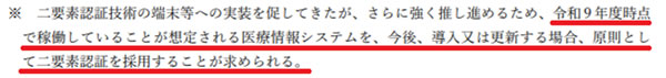 さらにガイドラインの中では二要素認証について以下記載があり、医療機関は 2027 年度中には医療情報システムにおいて原則二要素認証を導入する必要性について言及されています。
