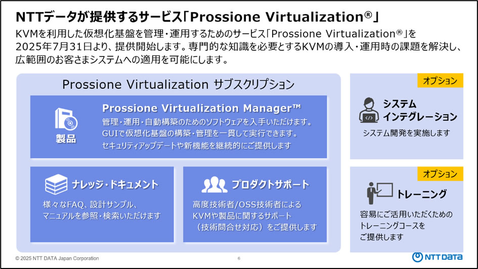 NTTデータが提供する「Prossione Virtualization」サービスは、Prossione Virtualization サブスクリプションを中心に、オプションでシステム開発を実施するためのシステムインテグレーションと、活用のためのトレーニングを提供します。