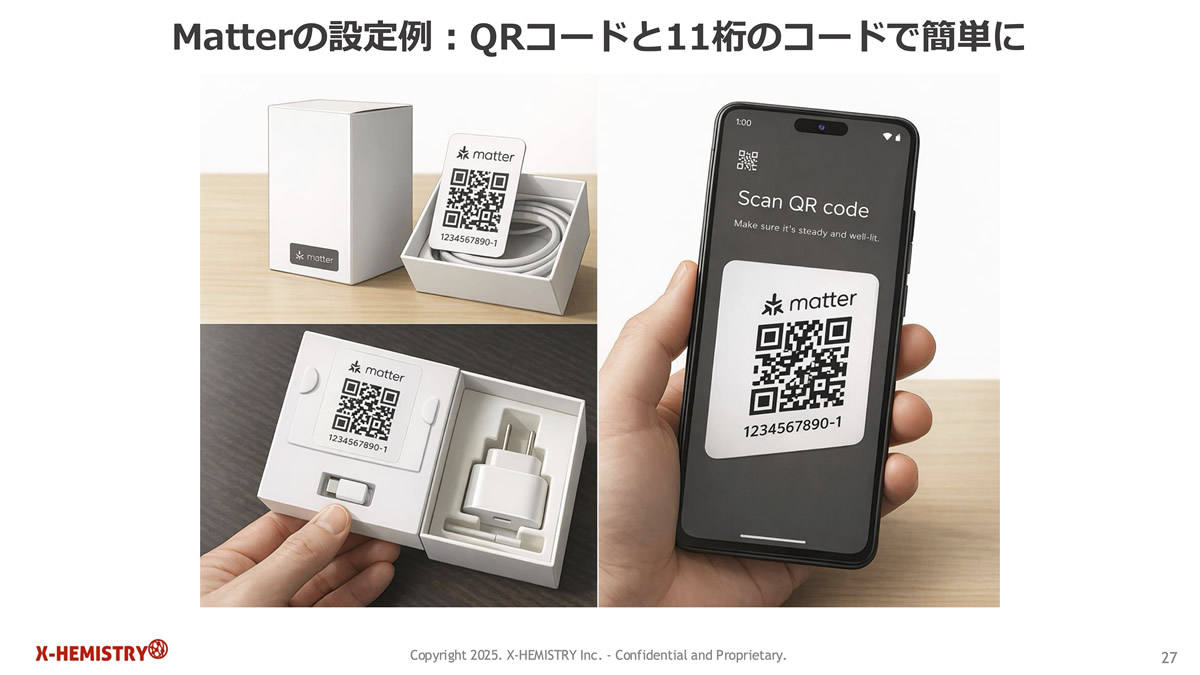 しかも、この初期設定はメーカーごとに異なっており、デジタル機器に慣れた人であってもストレスを感じ、時間がかかるものでした。しかし、Matter では、製品や説明書に記載された QR コードをスキャン(もしくは 11 桁のコードを入力)するだけで接続設定が完了します。