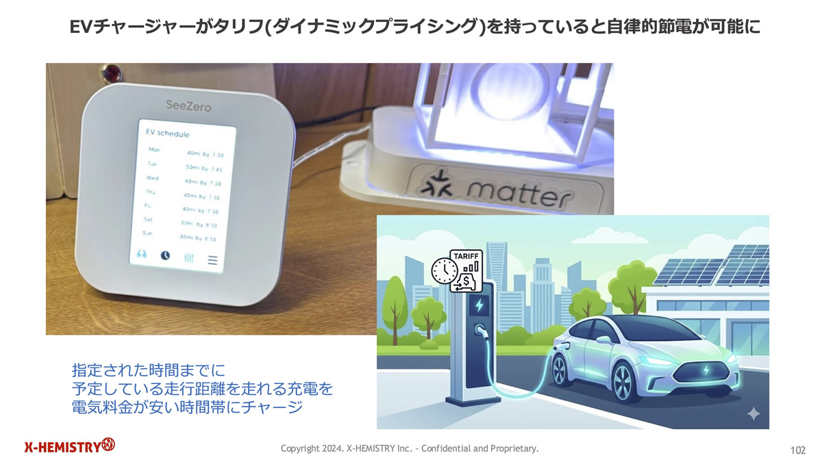 「もうひとつの目玉は、エネルギーマネジメントの強化です。欧米で進みつつある、市場の電力需給の状況に合わせて電気料金が変動するダイナミックプライシングに対応しています。これにより、自宅の電気自動車(EV)を充電する際に、より電気料金の安い時間帯にのみ充電を行う、もしくは再生可能エネルギーのみで充電するといったことが可能になります。EV だけでなく、家庭用の蓄電池や電力を多く使用する家電も Matter に対応することで、意識せずとも自動で節電できるようになるのです」(新貝さん)
