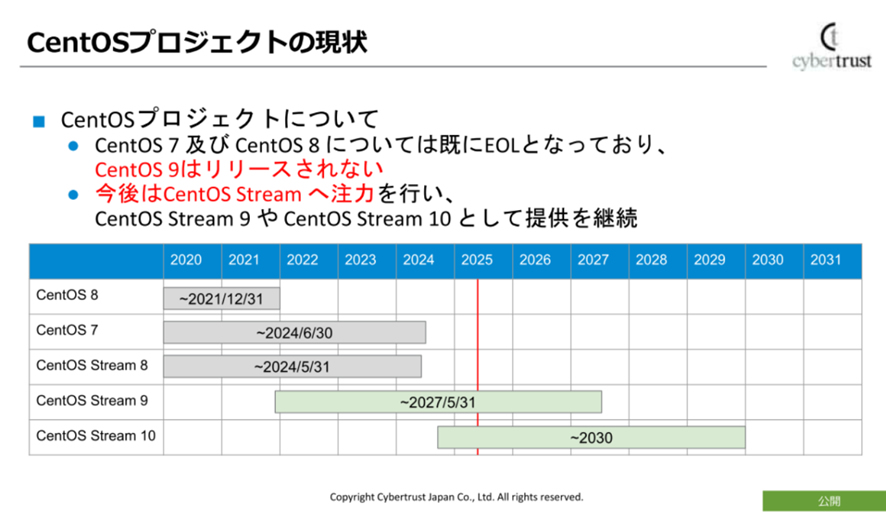 2020 年に CentOS の終了が発表されてから、すでに 4 年以上が経過しています。この発表により、CentOS 7 および 8 は EOL(End of Life)となり、CentOS 9 はリリースされないことが決定されました。現在の 2025 年時点では、CentOS 7 も既にサポート終了となっており、実質的に RHEL の開発用の OS である CentOS Stream 以外、CentOS が終了したと言える状況です。