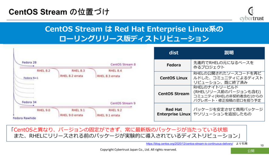 CentOS の後継として位置づけられる CentOS Stream についても重要な変化があります。CentOS Stream は今までの CentOS とは大きく異なる OS となっており、Red Hat のローリングリリース版ディストリビューションという性格を持っています。従来の CentOS と異なり、バージョンの固定ができず、常に最新版のパッケージが当たっている状態となっています。