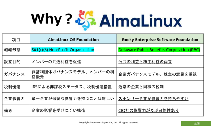 二つ目の特徴として、501(c)(6) 非営利団体のプロジェクト運営が挙げられます。これは Rocky Linux との重要な違いでもあります。Rocky Linux は公共の利益と株主の利益を両立する企業ガバナンスモデルを採用していますが、AlmaLinux は非営利団体ガバナンスモデルでメンバーの利益を優先しています。この違いにより、AlmaLinux では単一企業が過剰な影響力を持つことが難しく、企業の影響を受けにくい構造となっています。