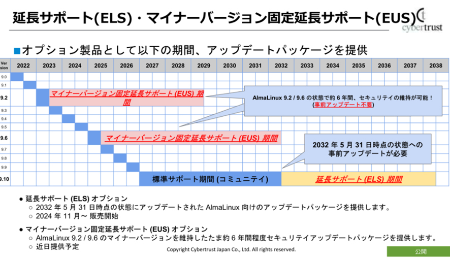 さらに、マイナーバージョン固定延長サポート(EUS)オプションでは、AlmaLinux 9.2 や 9.6 のマイナーバージョンを維持したまま約 6 年間程度、セキュリティアップデートパッケージを提供します。