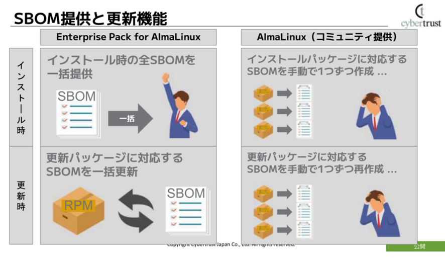 通常、SBOM の作成や管理には多くの手間が必要ですが、Enterprise Pack for AlmaLinux ではサイバートラストから SBOM を提供することで、利用者が SBOM の生成や作成を行わずに済みます。パッケージの更新に対しても SBOM を一括更新することで、手間をかけずに SBOM 管理を実現できます。
