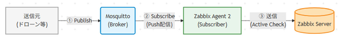 - Zabbix Agent 2 は Mosquitto に接続して待機します。Mosquitto にデータが届いたら Zabbix Agent 2 に push 配信されます。