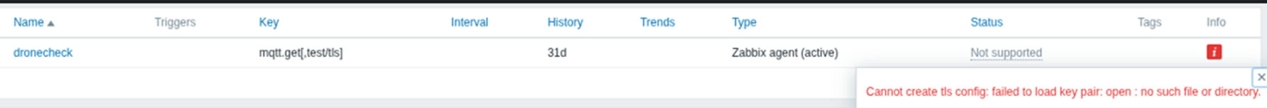 最終的に Zabbix としては、「failed to load key pair: open: no such file for directory.」というエラーが出力されます。