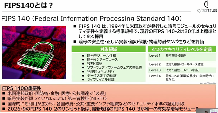 本トークセッションの大きなテーマの一つが、FIPS 140-3 への対応です。 FIPS(Federal Information Processing Standards)は、 米国政府が定める情報処理の標準規格であり、 中でも FIPS 140-3 は暗号モジュールのセキュリティ要件を定めた国際規格となります。 「FIPS-140-3 認証がなければ、暗号モジュールを使用する機器は米国政府に納入できません。実際に、グローバルな公共・防衛・重要インフラ分野では、製品やシステムが採用されないケースも増えています」と国外の動向について語る佐野。FIPS 140-3 では、従来の暗号強度だけでなく、鍵管理やファームウェア(電子機器に組み込まれたコンピュータシステムを制御するためのソフトウェア)更新を含む運用面、モジュール全体のセキュリティレベルなど、実運用を前提とした高度なセキュリティへの対応が求められます。