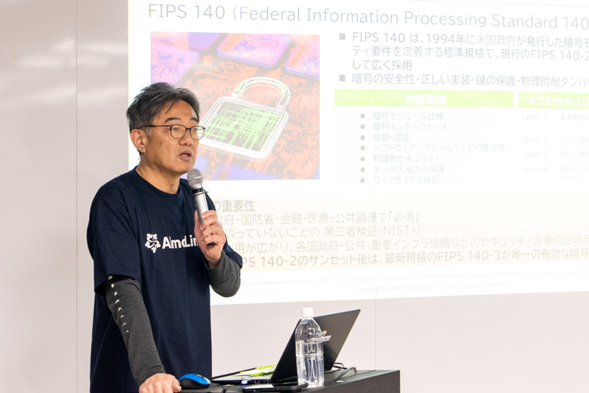 トークセッションでは、日本 AlmaLinux ユーザー会に参加する 4 社・1 団体が AlmaLinux の活用事例やコミュニティの発展に有益な知見を参加者と共有し、参加者が熱心にメモを取る姿も見られました。最終セッションを務めたのが、当社副社長 佐野 勝大による講演「AlmaLinux のセキュリティ機能評価と認証 ~FIPS140-3 認証、CC 認証取得への取り組み~」です。CentOS の後継サーバー用 Linux OS として採用が加速する AlmaLinux では、エンタープライズ利用で重要視されるセキュリティ機能を強化しています。今後ますます重要性を増す " セキュリティ標準 " への対応について、 AlmaLinux で対応している国際的な評価・認証規格 FIPS140-3 と Common Criteria(ISO/IEC15408) 認証の概要を解説しました。