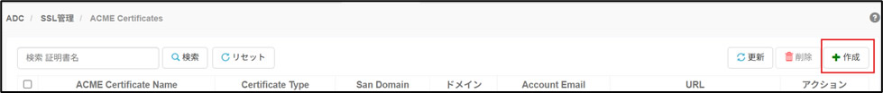 証明書の新規申請に向けて、ACME の設定を進めます。SSL 管理 ›› ACME Certificates から「作成」を押し、下記情報を登録していきます。