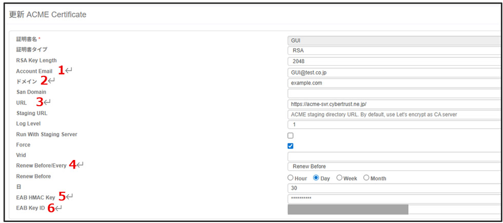 例)Renew Before day 30 で設定した場合は、証明書の残り有効期間が 30 日になると自動更新申請が実施されます。