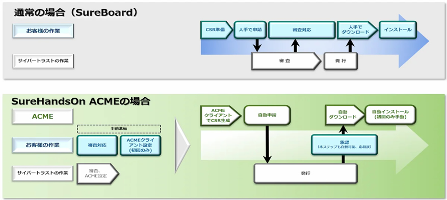 そこでサイバートラストが提供しているのが、「ACME(Automatic Certificate Management Environment:自動証明書管理環境)」という規格化された証明書の自動申請プロトコルを活用した、サーバー証明書の更新自動化ソリューション、「SureHandsOn ACME」です。