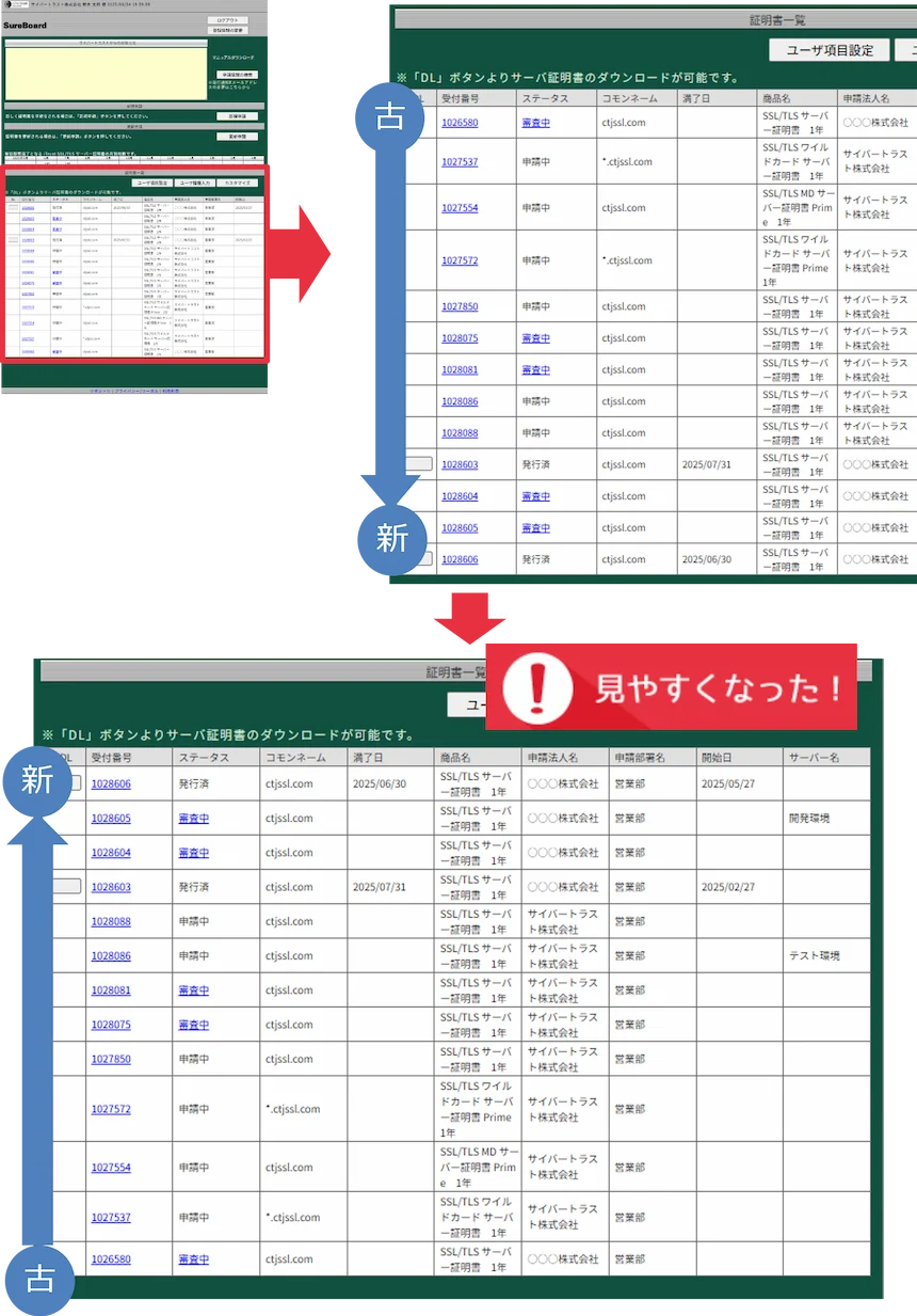 証明書一覧は、初期設定ではすべてのお申し込み情報が古い順に表示されます。 |
