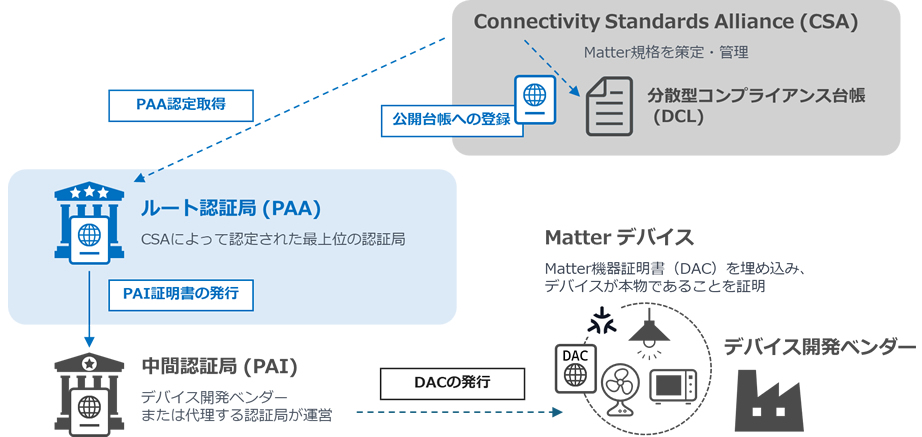 このたびの認定取得により、サイバートラストは Matter の標準化団体「Connectivity Standards Alliance(以下、CSA)」※3の Distributed Compliance Ledger(DCL:分散型コンプライアンス台帳)に信頼された認証局として登録されました。開発ベンダーは自社で PAA を構築・運用することなく、サイバートラストが厳格に審査した真正なベンダーのみに向けて発行する証明書を利用可能になりました。