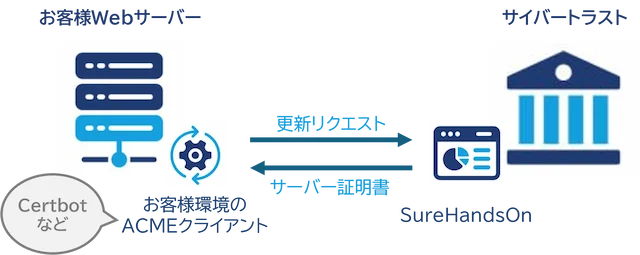 iTrust SSL/TLS サーバー証明書の証明書管理プラットフォームである SureHandsOn は、証明書の更新自動化に必要なウェブサーバーと認証局との間の相互作用の為の ACME プロトコルに対応しています。ACME に対応したクライアントソフトウェア(Certbot など)を利用することで、証明書の取得から更新までのプロセスを自動化することができます。