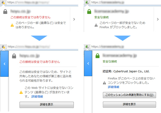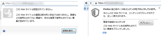 [Firefox] 「このWebサイトは認証されていません。」というメッセージが表示されたり、コンテンツがブロックされます。