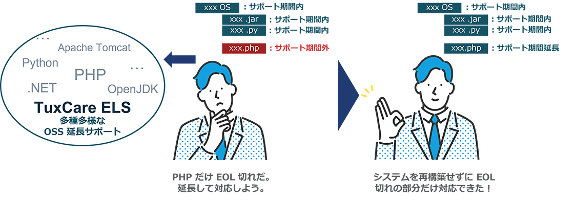 TuxCare ELS があれば、OSS を急いでアップデートしたりコストがかかるマイグレーションを慌てて計画する必要はありません。サポートが終了した OSS を安全な状態で必要な期間運用することができます。