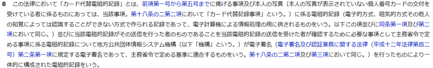 カード代替電磁的記録は、端的には「スマホにマイナンバーカードの情報を搭載したもの」です。マイナンバーカードの代替(カード代替)となる情報(電磁的記録)であって、格納される情報の出所はマイナンバーカードです。細かいお話をすると、「行政手続における特定の個人を識別するための番号の利用等に関する法律(以下、番号法)」において、以下のとおりカード代替電磁的記録の内容が定義されており、「マイナンバーカードの情報」と明記されているわけではありませんが、マイナンバーカードの情報が搭載されることに変わりはないため、本記事ではマイナンバーカードの代替として解説していきます。