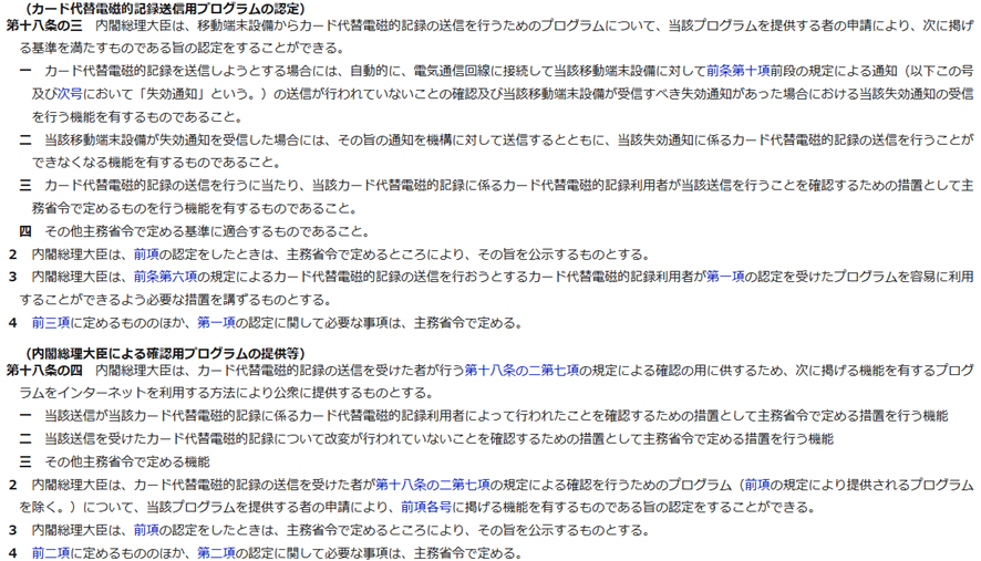 番号法においては、カード代替電磁的記録の発行、運用などの他、カード代替電磁的記録の送信用プログラム、確認用プログラムについても定められており、各プログラムについては内閣総理大臣の認定を受けるとされています。