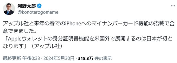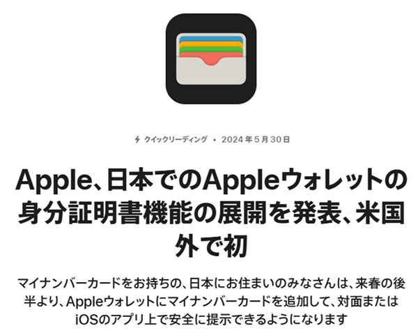 出典:Apple 「Apple、日本での Apple ウォレットの身分証明書機能の展開を発表、米国外で初」
