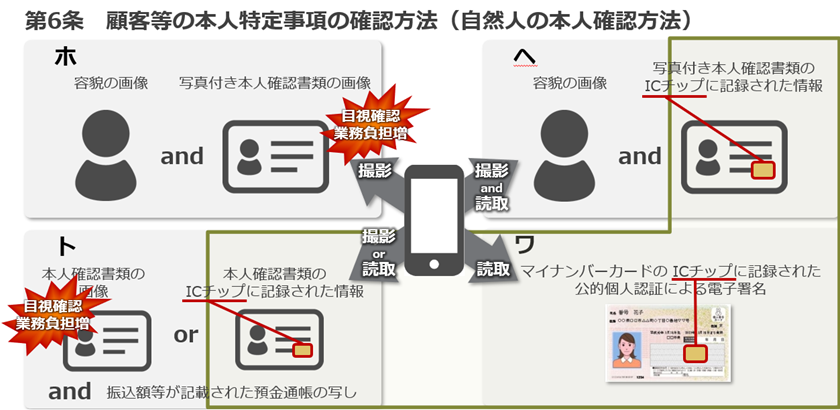 - 「写真付き本人確認書類の IC チップ情報」+「本人画像」 を用いた方法(該当条項 1 号ヘ)