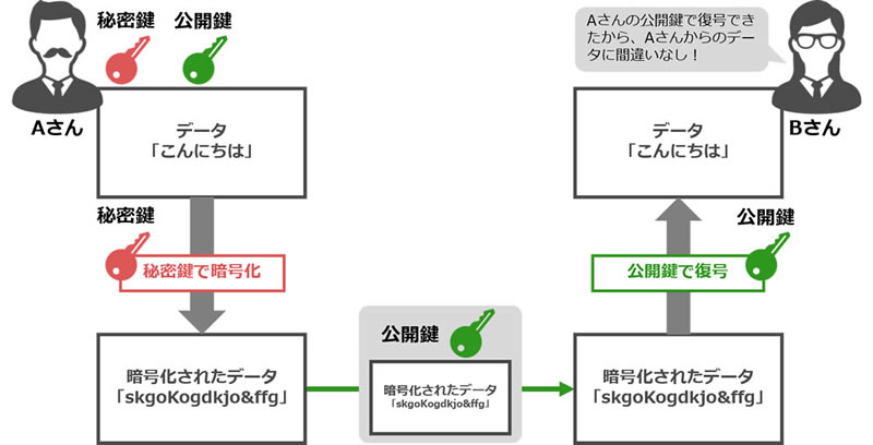 データが復号できた場合、公開鍵に対応した秘密鍵は A さん本人しかもっていないはずなので、このデータを暗号化したのは A さん本人に間違いないことになります。