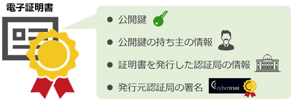 この公開鍵と公開鍵の持ち主を保証しているのが「電子証明書」です。電子証明書の中には、公開鍵と公開鍵の持ち主の情報が記載されており、これに間違いがないことは、発行元の電子認証局によって保証されています。