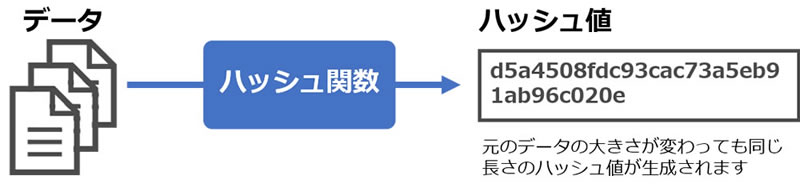 ハッシュ関数は、電子署名の中で使われている関数です。ハッシュ関数に任意のデータを与えると、決まった長さの異なる値(文字列)が返されます。ハッシュ関数が返す値のことをハッシュ値といいます。