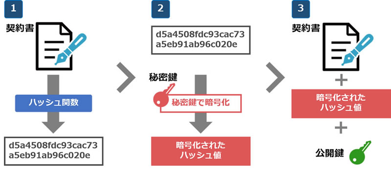 - 契約書データに暗号化したハッシュ値と公開鍵(電子証明書)を追加する。