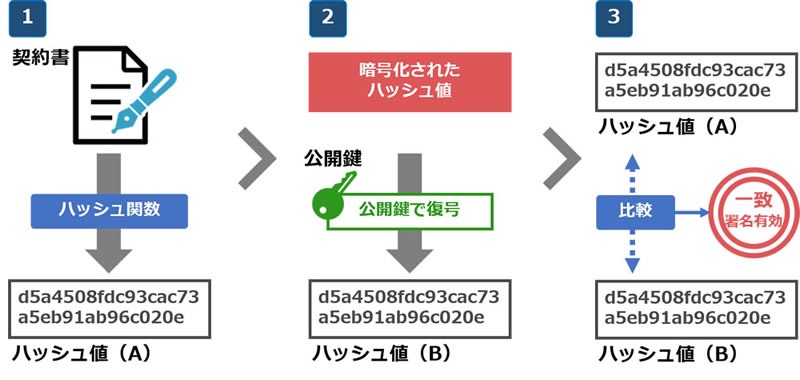 電子契約書に含まれている公開鍵で暗号化されたハッシュ値が復号できることで、契約者が間違いなく本人であることが確認でき、復号したハッシュ値と契約書のハッシュ値を比較することで、契約書に改ざんがないことを確認できます。