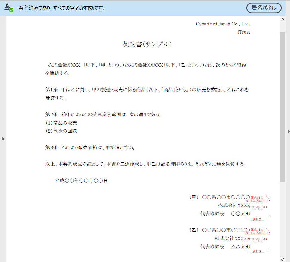 サイバートラストでは「iTrust 署名用電子証明書」ならびに「iTrust リモート署名サービス」を提供しており、電子署名された PDF は、Adobe Approved Trust List(AATL)に対応しているため、Acrobat Reader で開くと「署名済みであり、すべての署名が有効です」と表示され、視覚的に信頼することができます。電子契約での書面の締結にあたっては、印鑑の代わりに電子印鑑を押したいという日本特有の商慣習があり、印影機能を提供することにより、サイバートラストはこのようなニーズに対応することが可能です。