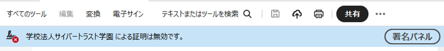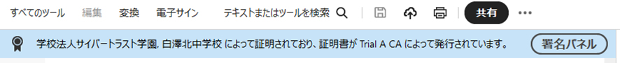 以下は、架空の学校法人ならび架空の中学校向けに発行した eシール用証明書を PDF ファイルに付与し、Acrobat Reader で開いています。