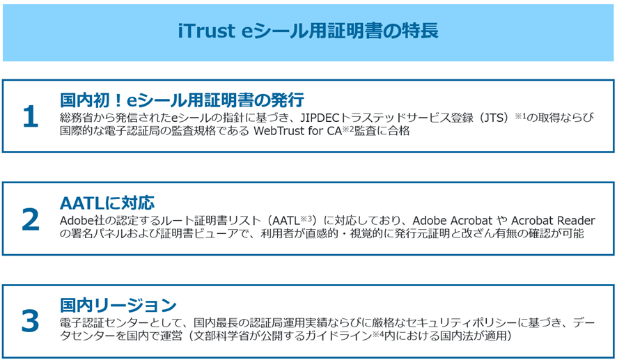 サイバートラストでは、安心・安全かつ信頼性の高い eシール証明書である「iTrust eシール用証明書」を提供しており、主に以下の大きな特長があります。
