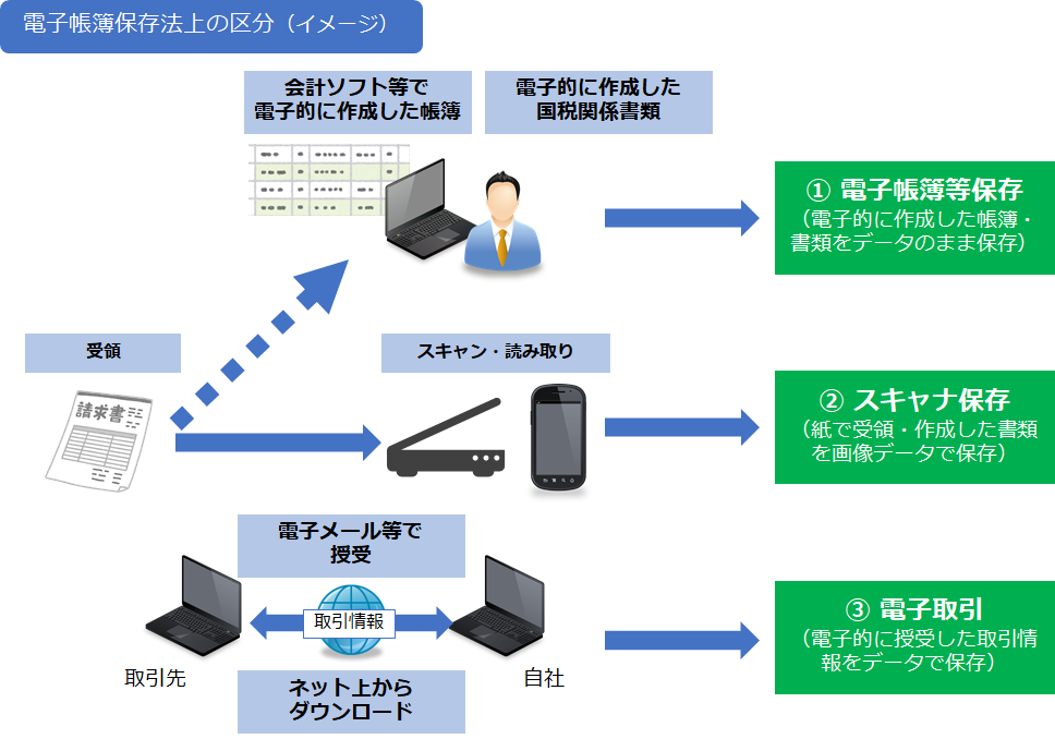 電子帳簿保存法は、各税法で原則紙での保存が義務づけられている帳簿書類について一定の要件を満たした上で電磁的記録(電子データ)による保存を可能とすること、および電子的に授受した取引情報の保存義務等を定めた法律です。電子帳簿保存法上、電磁的記録による保存は、大きく図内右の3種類(①電子帳簿等保存、②スキャナ保存、③電子取引)に区分されています。