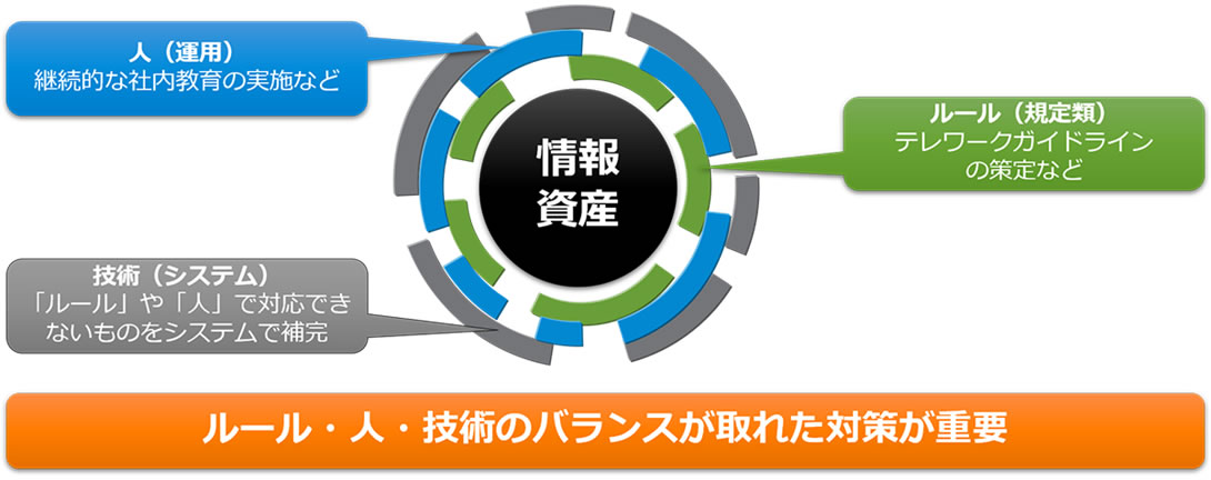 テレワークの導入にあたっては技術(システム)のみの導入では不十分で、「ルール」「人」を組み合わせた多層防御による対策が重要です。