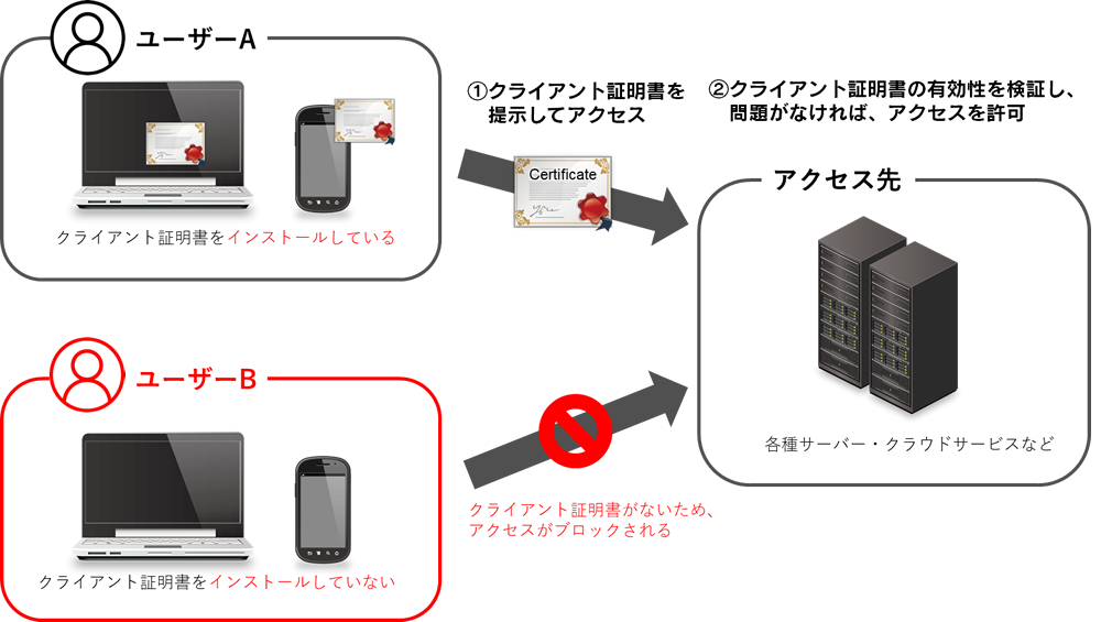 クライアント認証とは、コンピューターシステムやネットワーク、サービスなどにアクセスする際、アクセス元となるユーザーまたはクライアントがインストール済みのクライアント証明書をアクセス先に提示して、アクセス先が正当なユーザーであることを認証するための仕組みです。