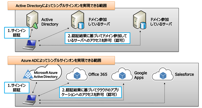 Azure AD の利用にあたっては、Active Directory(AD)および Active Directory フェデレーションサービス(ADFS)が必要ですが、クラウドサービス利用時のセキュリティを強化することが可能です。
