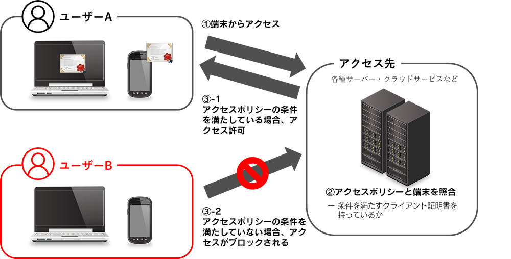 上記図解のとおり、アクセスを許可するクライアント証明書に関する情報をアクセス先にあらかじめ登録しておき、アクセス先がアクセスポリシーとの照合を行った結果、「問題なし」と判断した場合にその端末のアクセスを許可します。