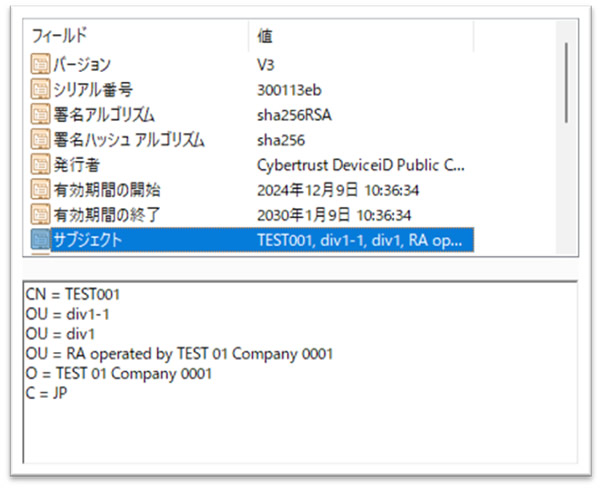 - 以下の「電子証明書内のデータ例」をベースにすると、教職員向けに発行する電子証明書の "OU" に "div-1-1" と指定し、教職員のみをアクセスさせたい Web サーバーやクラウドサービスで電子証明書+電子証明書内の "OU" の値を参照してアクセス制御を実施