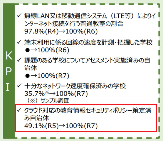 文部科学省は「教育 DX に係る KPI」を公表しており、その中で各地方公共団体の教育委員会において教育情報セキュリティポリシーを策定しているところは半数に満たない状況ですが、これを 2025 年度中に 100% を目指し取り組んでいくとしています。