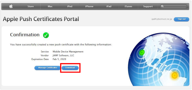 - Apple Push Certificates Portal にて、取得した CSR をアップロードの上、Apple プッシュ証明書を取得