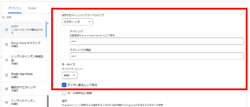 チャレンジ / チャレンジの検証: 当社からご案内する「SCEP オプションチャレンジパスワード」の値を入力します。