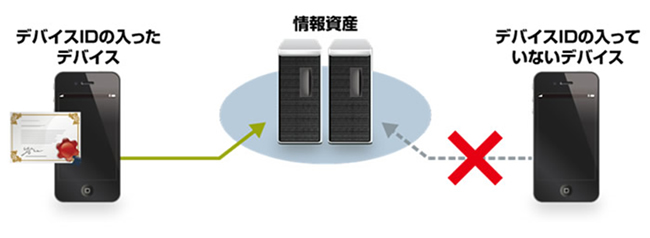 デバイスID 証明書をインストールしている端末からのアクセスのみを許可( 端末認証 )するといったことが可能となるため、第三者の端末や組織が管理していない端末からのアクセスを防ぐことができます。