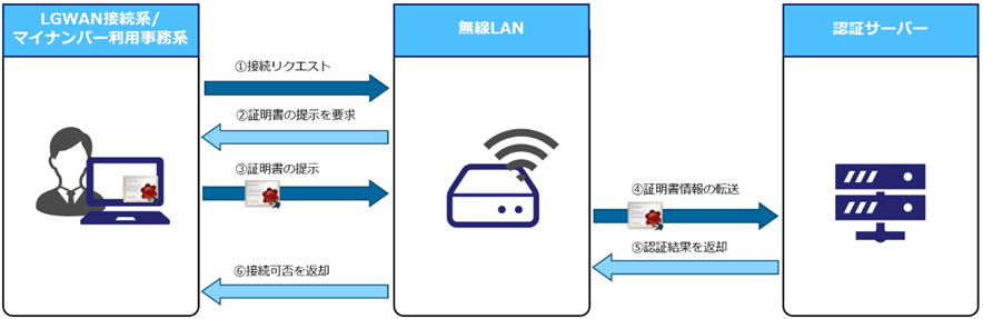 地方公共団体(自治体)で管理していない第三者の端末が、無線 LAN にアクセスできてしまうと、業務情報の盗聴や不正な情報収集のリスクが生じます。このリスクを軽減するため、端末にインストールした クライアント証明書を用いた認証(EAP-TLS 認証)を実装することで、地方公共団体が正式に管理・承認している端末のみが無線 LAN ネットワークにアクセスできる環境を構築 します。この認証方式により、クライアント証明書を保持する認証済み端末のみが接続可能となり、不正アクセスを効果的に防止することが可能となります。